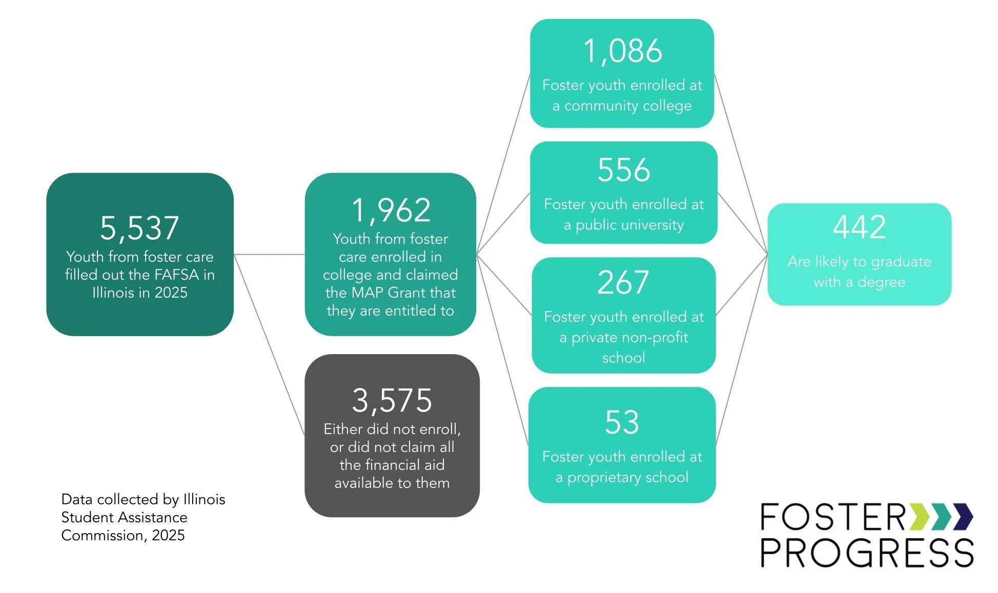 In Illinois, we compared the number of youth who filled out the FAFSA (the first step in applying for financial aid) to those who actually enroll in college and those who will likely end up graduating. These numbers make a clear case for programming like ours that prepare and support foster youth in their pursuit of higher education.