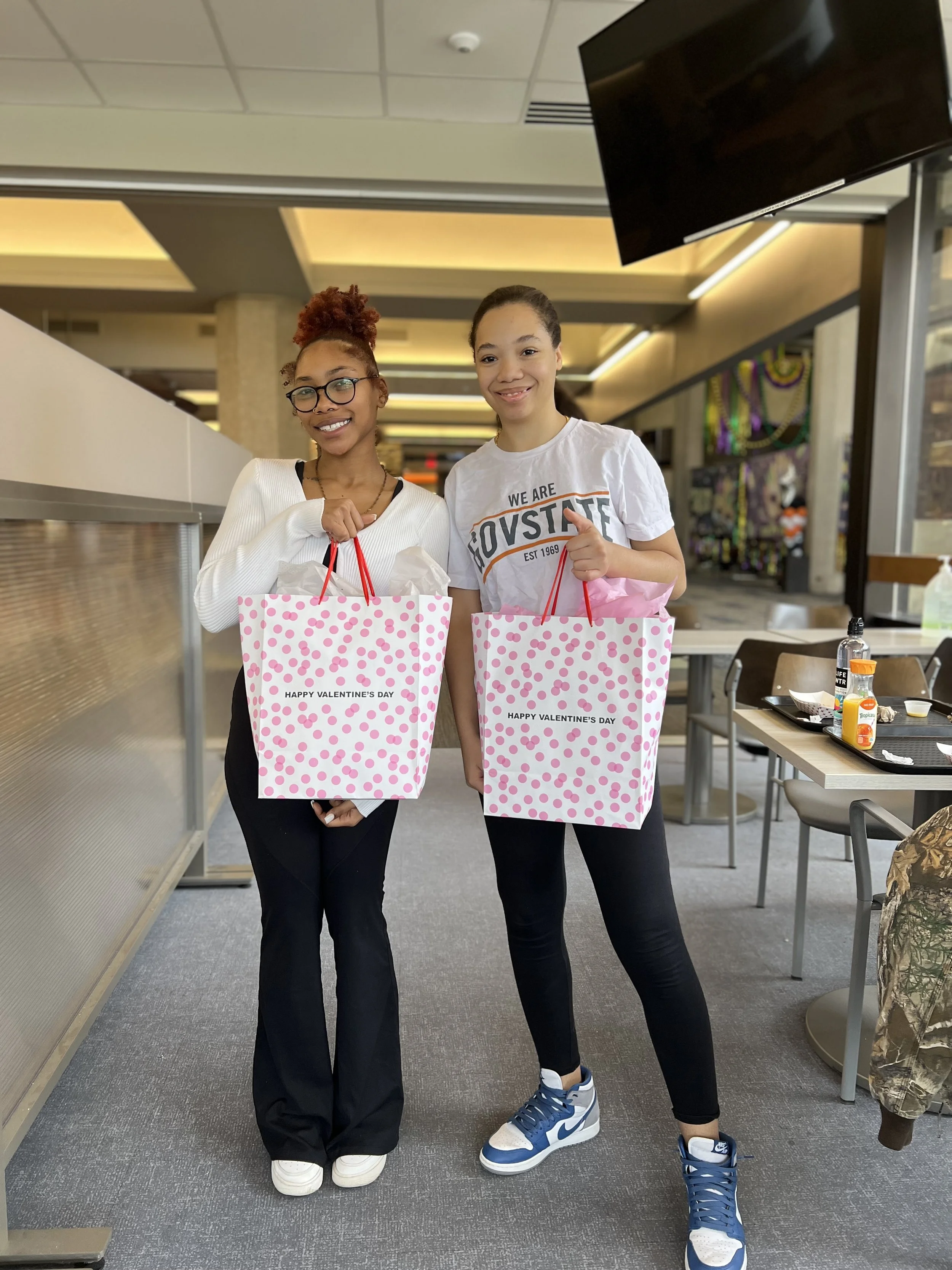 Y-CAP program manager, LT, visits Y-CAP participants Kyla and Kayla at Governors State University, for Valentines Day! We wanted to celebrate the ladies hard work in their university classes and Y-CAP with some Galentines Day goodies.